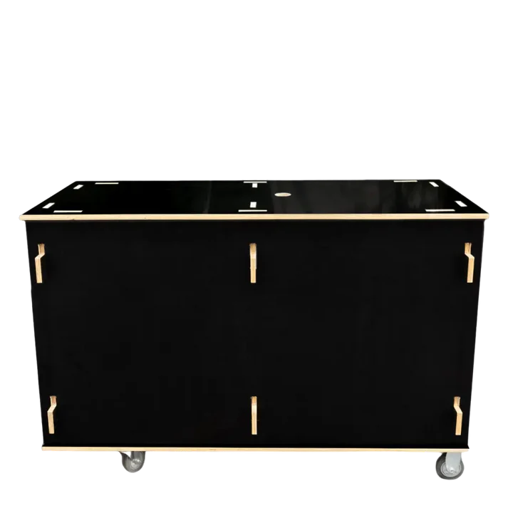 This flat-pack modular coffee bench cart has lockable caster wheels for easy movements and comes in 7 stackable pieces. Easy storage and made with black marine grade plywood. There are holes on top for cable plug ins.