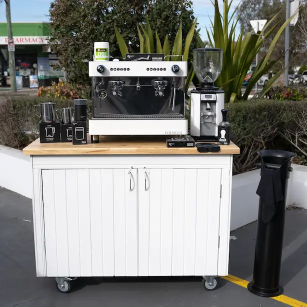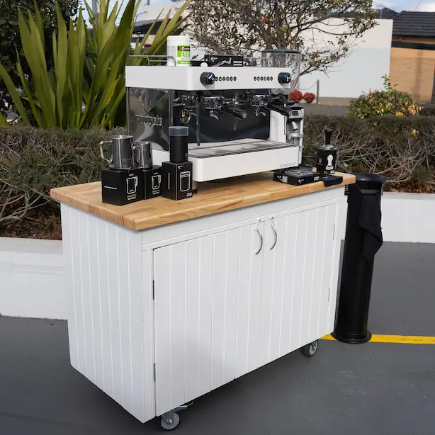 Beautifully hand-made coffee cart that is fully mobile and fitted with a hole in the top of bench to fit machine tubes as well as enough storage internally to fit milk, mini fridge and any other consumables or accessories that are necessary for your mobile business.