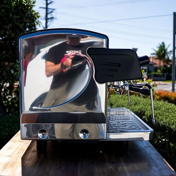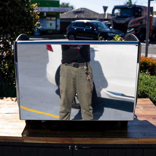 Pre-loved Expobar Zircon 2 group coffee machine in tall cup configuration, running on a standard 15 amp plug.