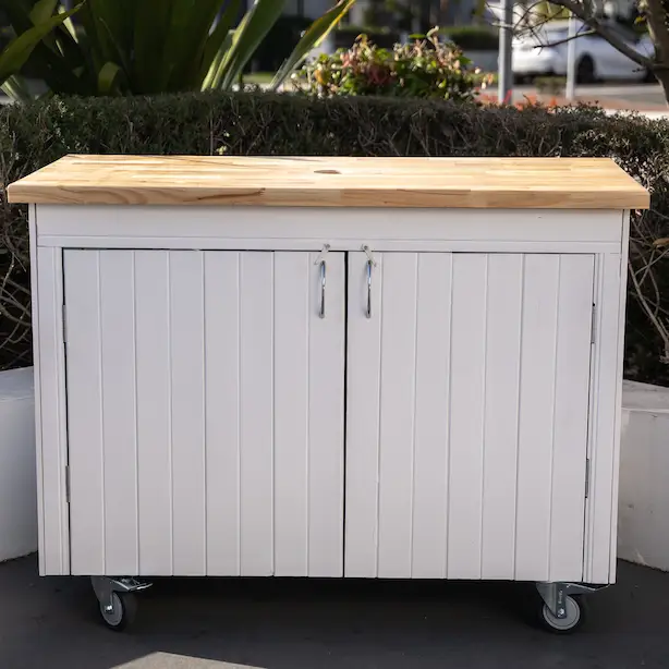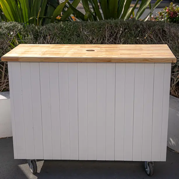 Beautifully hand-made coffee cart that is fully mobile and fitted with a hole in the top of bench to fit machine tubes as well as enough storage internally to fit milk, mini fridge and any other consumables or accessories that are necessary for your mobile coffee business.